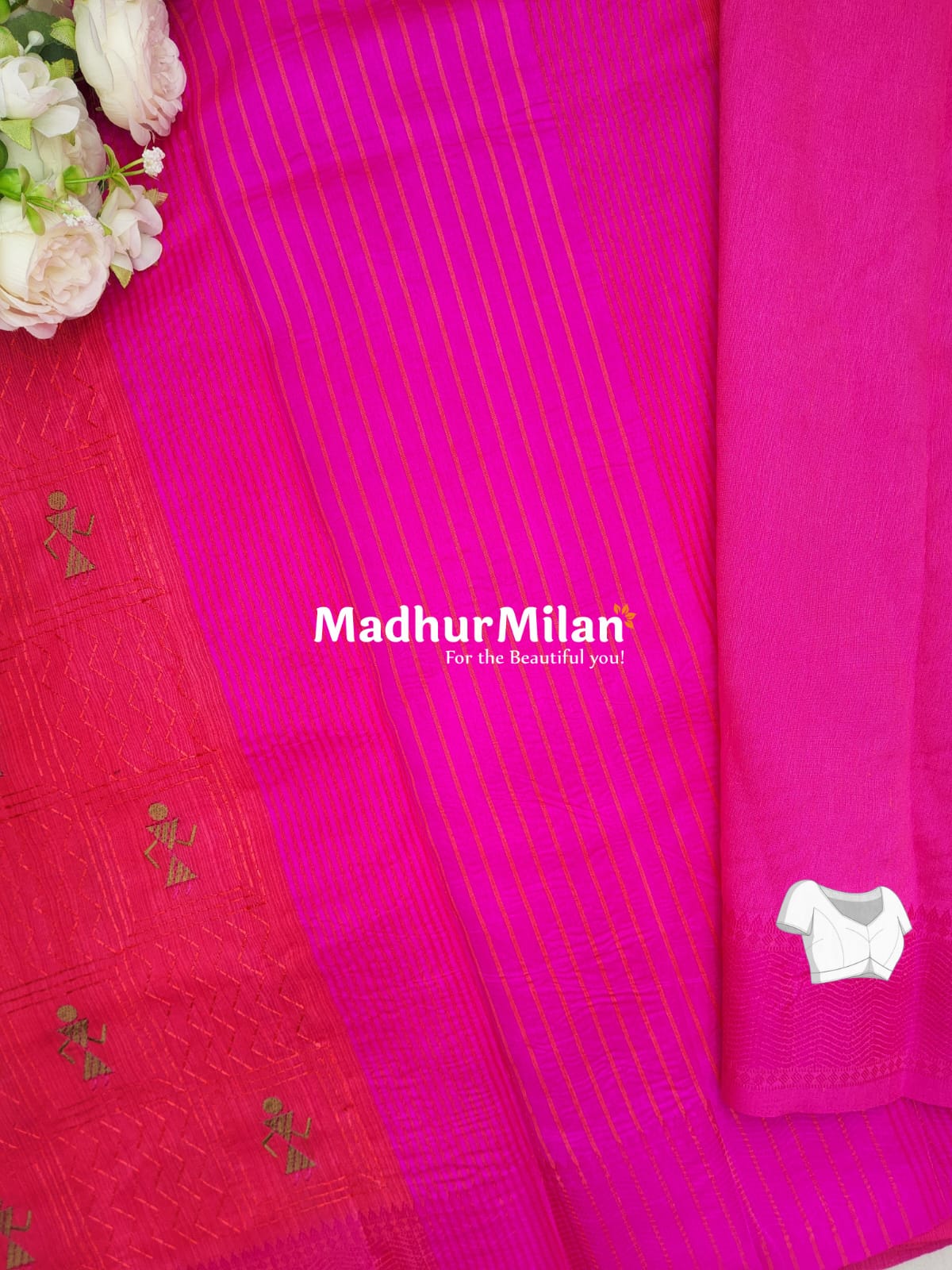 This WARLI EMBROIDERY WORK RAW SILK SAREE is a perfect blend of tradition and contemporary style. The unique Warli art embroidery adds a touch of cultural richness, while the vibrant pink color ensures you stand out in any crowd.